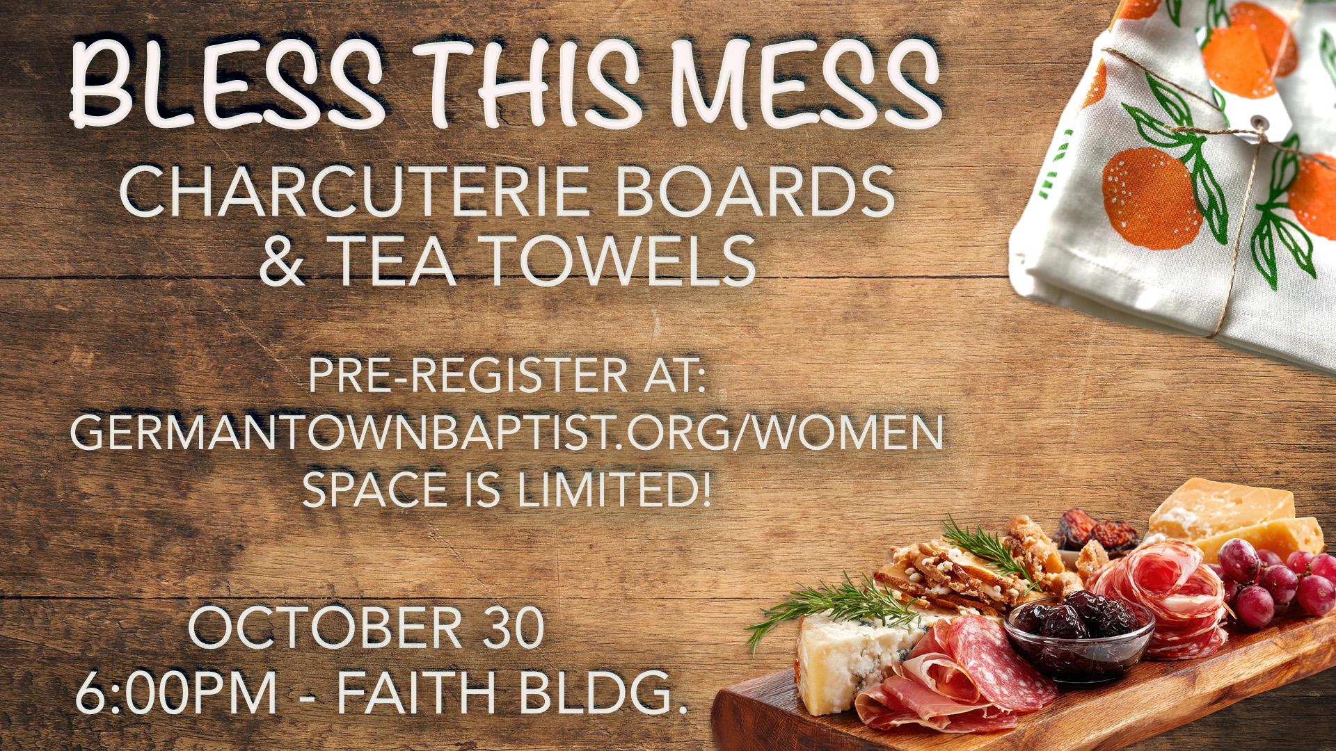 Make your own charcuterie board to take home or eat as your snack. AND paint a tea towel (no talent needed). Come and join us for a fun-filled evening of creativity and fellowship on Thursday evening, October 30 in the Faith Building. Cost is $20 and space is limited. Register here or call 901.260.5763. Childcare is available with registration.